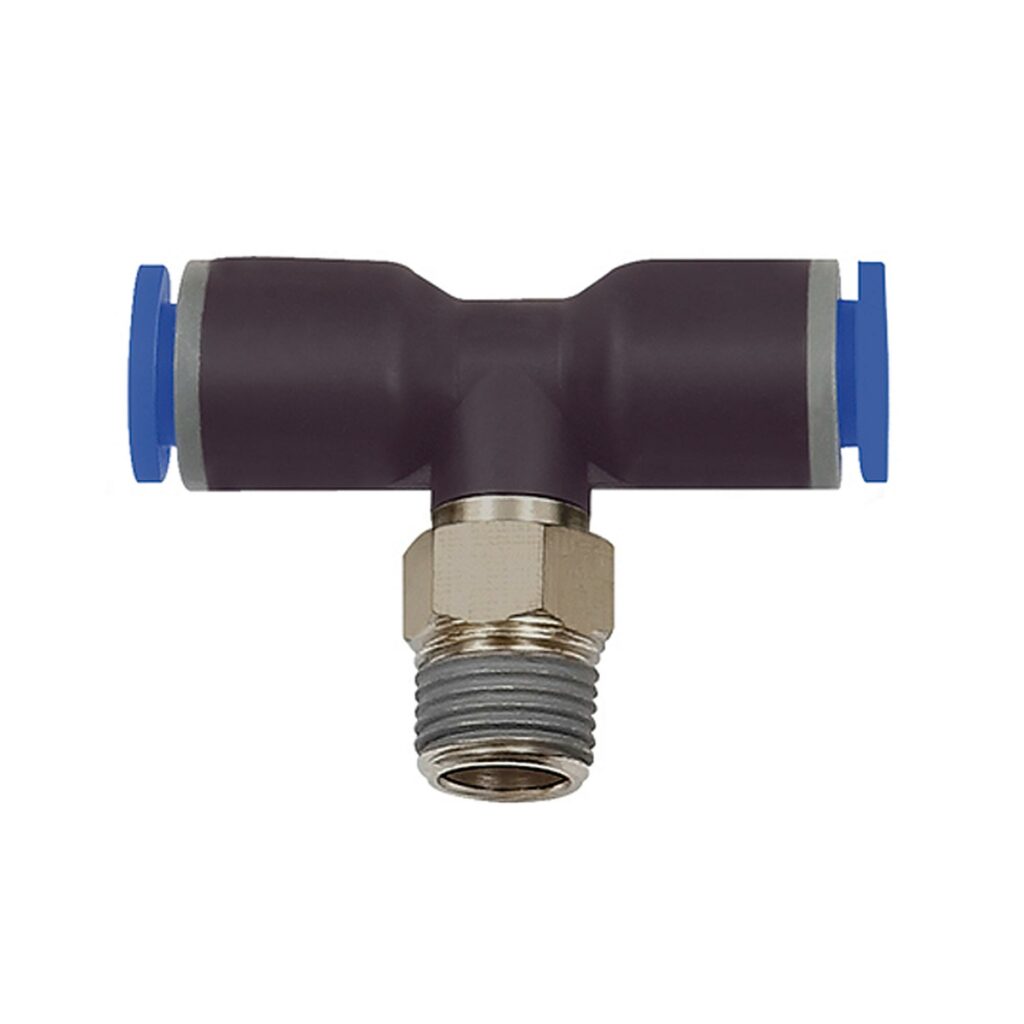 T-Steckverschraubung »Blaue Serie«, drehbar, R 1/8 a., für Schlauch-Außen-Ø 4 mm, pmax kurzzeitig 15 bar, Kunststoff/MS vern.. Unsere Schnellsteckverbinder-Serie aus Kunststoff bzw. vernickeltem Messing. Die Teile sind einsetzbar in Verbindung mit Kunststoffschläuchen und Kunststoffrohren.
