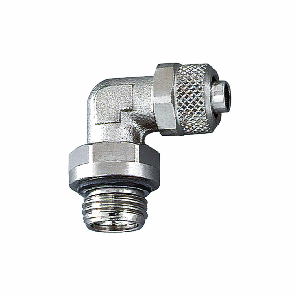 Winkel-Einschraubverschraubung, nicht drehbar, ohne O-Ring, M5 a., für Schlauch 5/3 mm, SW 8, Arbeitsdruck max. 18 bar, MS vern..